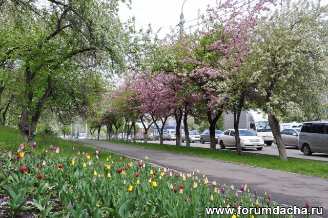 Краснолистные яблони на улицах города.