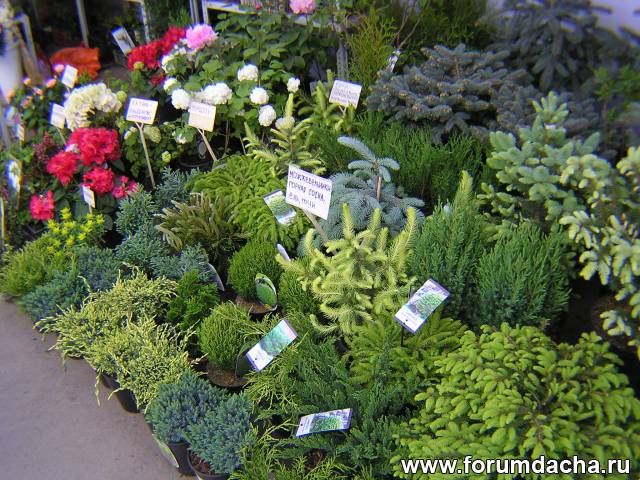 На рынке ассортимент растений огромный.Много колонн.Президент,Валюта и Васюган самые частые.Стоимость колонны один метр высотой 1000 рублей.Много супер карликов даже с цветами.