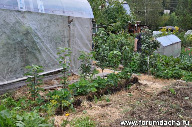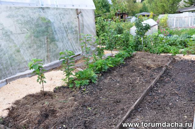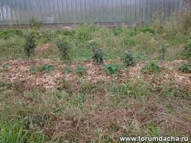 Почти закончился наш дачный сезон .Лето было необычайно коротким и дождливым.Яблони долго пытались начать расти.Но не давал холод .Температура выше 10 установилась с 15 июля!Я боялся что земля переувлажняется и разгородил грядки с яблонями.Засыпал междурядья опилками,уложив под них навоз.Влажность стала оптимальной(Измерял влажномером)
