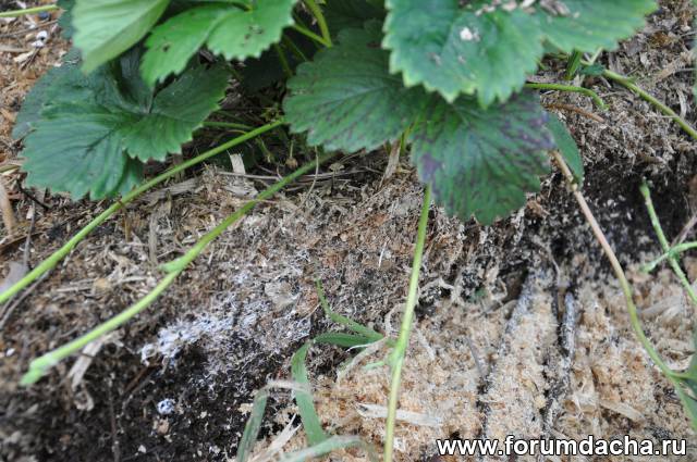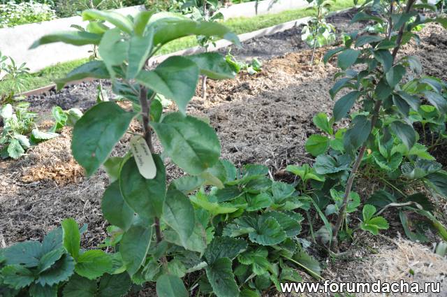 Под яблонями высадил клубнику,как уплотнитель и как маячек,показывающий,все ли хорошо с питанием.
