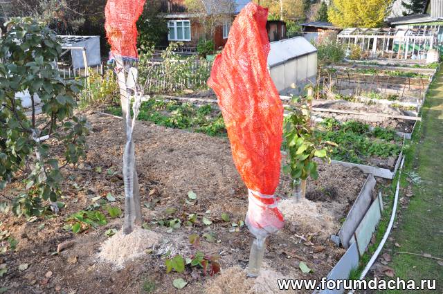 Эти две яблони сбросили литья,их закрыл полностью сеткой-мешком от зайцев.У нас они срезают все,что торчит выше снега.