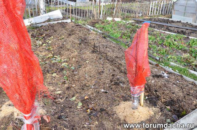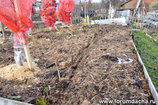 Пришлось прорезать замершую корку из мульчи.и в этот рез садить.Получилось на глубину 5 см.