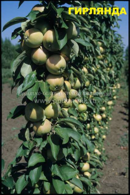 Гирлянда. Сорт орловской селекции, средней силы роста. Иммунный к парше, осеннего срока созревания и потребления. Плоды желто-зеленые с небольшим румянцем. Вкус кисло-сладкий. Мякоть сочная, нежная, дегустационная оценка 4,2 балла. Сорт исключительно урожайный. При перегрузке урожаем плоды сильно мельчают Средняя масса плода 140 г. Сорт отличается практически полным отсутствием бокового ветвления.