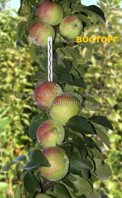 Восторг. Сорт орловской селекции, средней силы роста. Высокоурожайный, иммунный к парше, позднеосеннего-раннезимнего срока потребления. В холодильнике плоды хранятся до февраля. Окраска плодов от желто-зеленой до желтой, покровная окраска в виде сильного румянца красного цвета. Плоды средней массой 170 г. Мякоть плодов зеленоватая, нежная, сочная. Плоды кисло-сладкого вкуса, дегустационная оценка 4,3 балла.