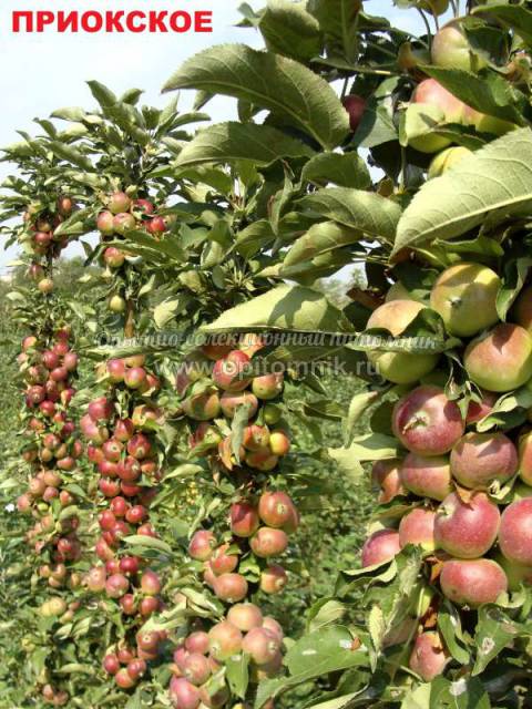 Приокское. Сорт орловской селекции, средней силы роста, зимнего срока потребления. Сорт средне устойчив к парше. Плоды выше среднего размера, 150 г. Плоды средней массы (150 г), приплюснутые, конические, широкоребристые, скошенные. Кожица на плодах гладкая, блестящая. Основная окраска плодов во время съема зеленая, а в состоянии потребительской зрелости зеленовато-желтая. Покровная окраска на большей части поверхности плода размытая, темно-красная во время съема и малиновая в период потребления. Мякоть плодов зеленоватая, средней плотности, колющаяся, мелкозернистая, очень сочная. На вкус плоды кисло-сладкие, со слабым ароматом. Дегустационная оценка плода 4,5 балла.