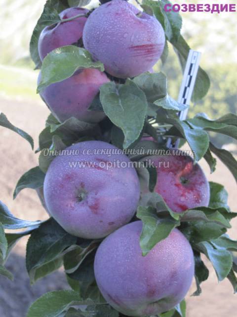 Созвездие. Сорт орловской селекции, средней силы роста. Сорт зимнего срока потребления. В холодильнике плоды хранятся до марта. Сорт иммунен к парше. Плоды имеют темно-красную окраску, средний размер плодов 125 г. Вкус хороший, дегустационная оценка 4,3 балла.