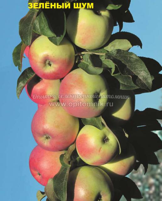 Зеленый шум. Сорт орловской селекции, средней силы роста, поздне-осеннего – ранне-зимнего срока потребления. Плоды средней массой 200 г. Окраска плодов зеленовато-желтая с ярко выраженным малиновым румянцем на большей части плода. Мякоть плода плотная, мелкозернистая. Вкус плодов кисло-сладкий со слабым ароматом. Дегустационная оценка 4,4 балла.