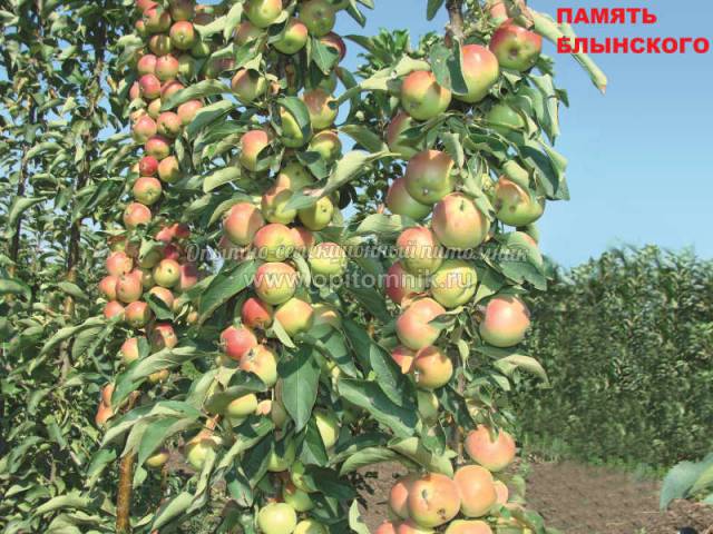 Память Блынского. Сорт орловской селекции, средней силы роста иммунный к парше позднеосеннего-раннезимнего срока потребления. Плоды средней массой 140 г конической формы. Основная окраска зеленовато-желтая, покровная занимает большую часть плода в виде красного румянца и полос. Мякоть мелкозернистая, сочная. Кисло-сладкого вкуса. Дегустационная оценка 4,3 балла.