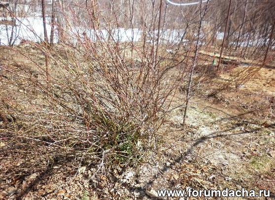 Кусты голубики после зимовки. Постепенно поднимаются. Листья облетели.