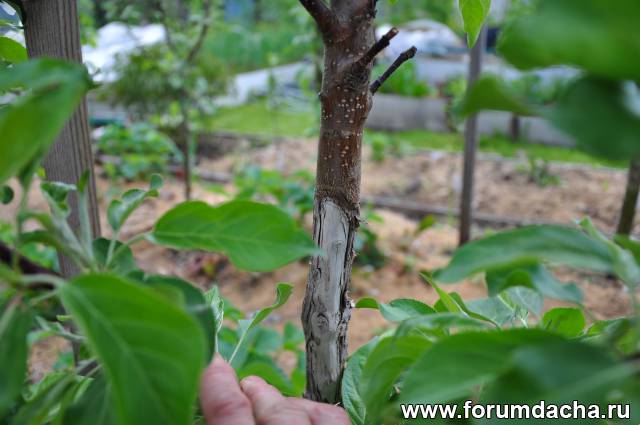 | Участки у нас имеют северо-западный уклон, преобладающие ветра тоже северо-западные. Снег сильно "сушиться", плюс солнечные ожоги. В округе и сильнорослые яблони и груши страдают от повреждения стволов на высоту до 1,5 метров. Очень вероятно, что этому способствует зимнее иссушение. |