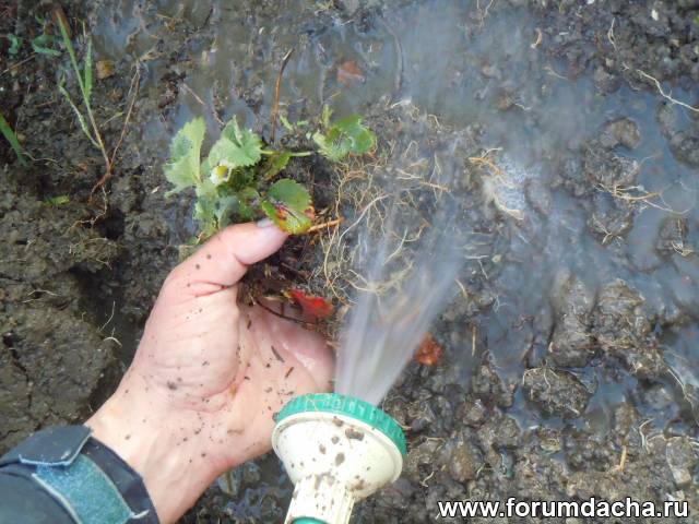 Очень нравиться садить клубнику по "опилочной" технологии". Легко, удобно. На фотках привожу пример как я сажал с комом земли. Но сейчас сажаю по другому- с мытыми корнями. При отмывании корней под струёй воды обнаруживается на некоторых кустах много маленьких личинок хруща (ну мы об этом разговаривали уже). Что интересно: Считается, что при пересадки клубники с открытой корневой системой- она неизбежно болеет. - Так вот при "опилочной "технологии я этого не вижу. У нас то -холод, то жарко, то ветер... А кустики выглядят замечательно.