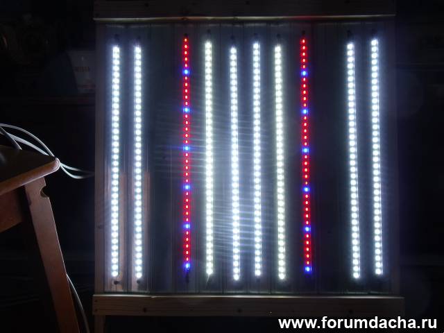 Свет фитопланок мне показался слишком избыточным по красному спектру. Поэтому в готовом светильнике оставил всего две планки с фитодиодами. Остальные поставил с холодным белым светом.