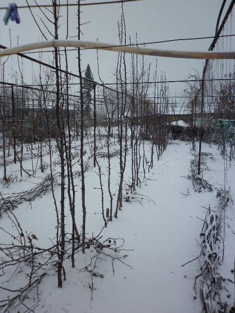 Деревья после пригибания на зиму, в сравнении с колоннами, на винограднике.