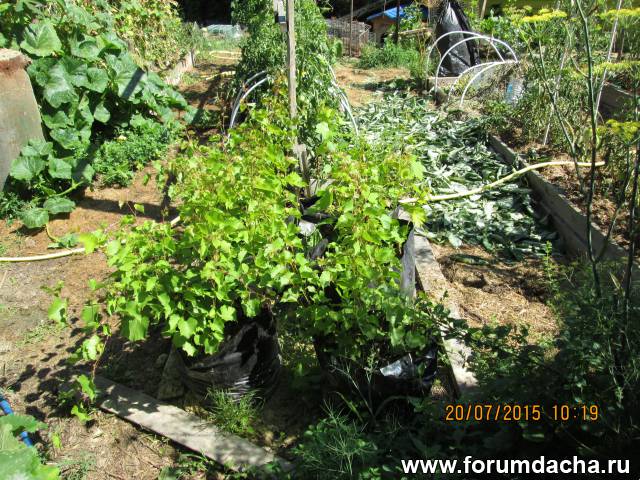 Теперь хочу поделиться по поводу того что касается органической технологии в выращивании винограда. Проводил я два года назад землекопательные работы рядом с забором, где у меня течёт арык. Вывернул "на гора" много подстилочной породы, а она у нас в Новороссийске богата известняком. Затем вдоль этого места посадил подвойный виноград. А в 2015г привил на него культурные сорта. И на некоторых кустах, весной заметил признаки хлороза. Помятуя об учении А. И. Кузнецова о хемотропизме, я замульчировал толстенным опадом весь ряд. И хлороз исчез! Но мы с женой завели курочек, нам стало жалко держать их всё время в загородке и в конце лета начале осени мы их стали выпускать в огород. Что они сделали с огородом  Они как экскаваторы перевернули всю мульчу, да ещё и несколько раз! С под винограда о котором я пишу смели её совсем. И куст стал опять хлорозить! Вот так.