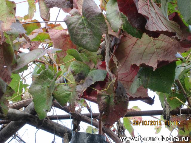 В конце сентября 2015г виноградный куст стал готовиться к зиме. Каково же было моё удивление, когда я увидел, что листья не желтеют а багровеют.