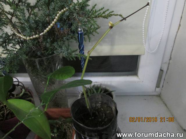 Опытные виноградари мне объяснили, что если на виноградном кусте наблюдается осенью такое явление, то это 100% признак того, что ягода у этого сорта тёмно окрашена. Но это правило не обратимо. Например у тёмной Молдовы лист желтеет. Но если Вы увидите осенью на винограднике кусты с багровыми листьями- это будут кусты с тёмными ягодами! На этом фото внизу Вы можете увидеть верхнюю часть кулька воздушной отводки. Я их сделал 4 шт. Лоза на одной из воздушных отводок не одеревенела. Я срезал её дней 7 назад и занёс в дом. Морозы у нас начались 30.12.2015г. До этого была положительная температура. Посмотрите: начала пробуждаться почка! Просто вот такое наблюдение, я раннее не встречал в литературе упоминания того, что не вызревшая виноградная лоза в тёплом помещении зимой пойдёт в рост.