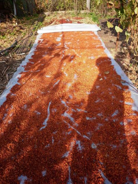 А если для массового посева используются плоды ранеток, то есть- мелкие плоды, то, да, измельчаю на "мясорубке", типа "промышленной" ( с насадками: терка, шинковка и т.п.), с высокой производительностью. Использую насадку- "терка", или "шинковка" (выбор зависит от сочности плодов). Потом подсушиваю. А осенью высеваю прямо в виде "сухофруктов". Примерно вот так: