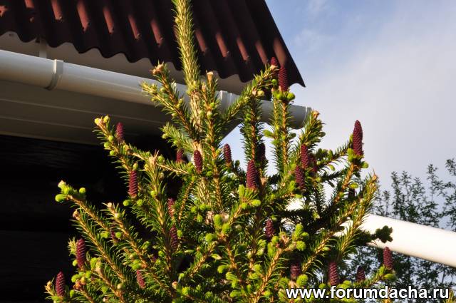 Восемь лет назад посадил елочку около дома,в надежде,что буду приезжать на новый год и наряжать.Стригу ее,не даю расти в высь.В этом году зацвела-красиво,будут первые шишки.