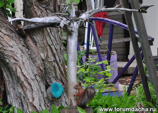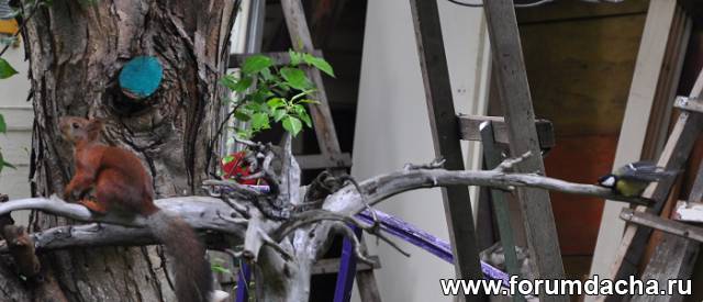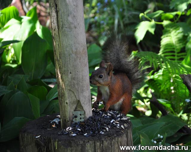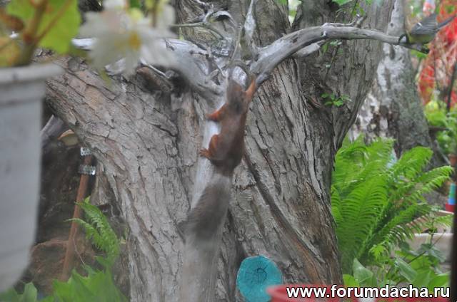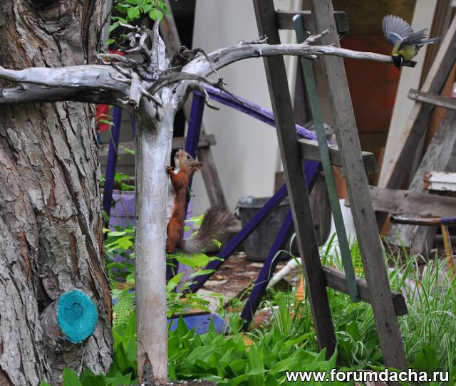 Белочка кушает семечки а синица(в левом верхнем углу)ее пугает.