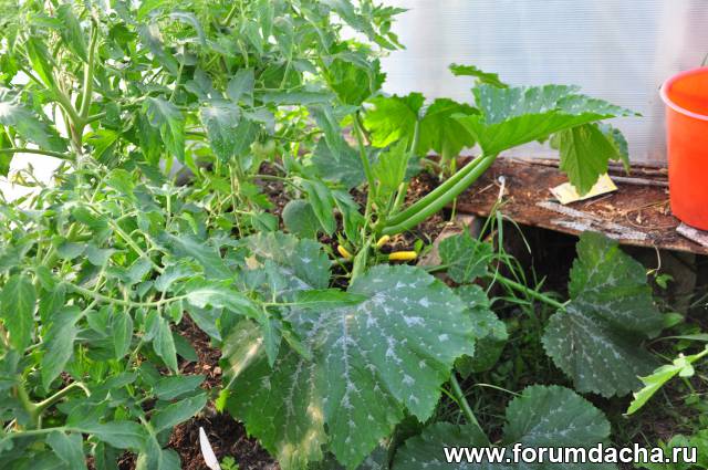 В начале лая садил в этой теплице рассаду тыкв и кабачков,уронил семечко,оно проросло среди помидор.