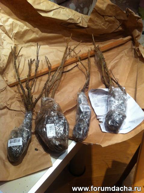 Сегодня получила посылку.Кажется,все нормально.Меня только смущает,что черешня Ипуть-длинная веточка,сверху обрезанная и почек мало ,но корни мощные ,в гели,видно,что живые.Хотелось бы узнать у rc12rc -это нормально?(отрезанный верх) и как же ее укрыть,в 5-литровую бутыль она явно не полезет,у нее стволик около 50 см.и в палец толщиной.Наверное ее лучше прикопать?Вторая черешня Овстуженка -кустик поменьше-где-то 30см.Верхушка целая.почек много,корни хорошие,в гели.Ее я надеюсь уместить в баллон,вот только не знаю,сразу ее укрывать лутрасилом и торфом(я поеду сажать завтра с утра)или попозже?Кстати,посылка была запакована в плотную бумагу и внутри лежала палка,чтобы веточки не сломались.Комплектовщик 23,спасибо.Вот фото моих кустиков: