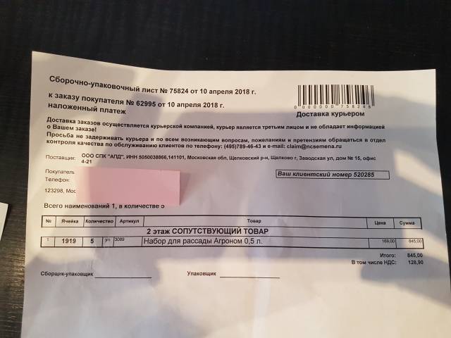 Сегодня получила заказ от Русского огорода. Заказ 62955 от 10.04.2018г. Набор рассады "Агроном" 0,5л. в количестве 5 шт. По комплектации претензий нет.