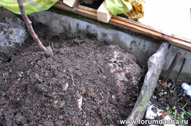 Обсыпал корни тремя ведрами земли.Справа положил большой комок мицелия.