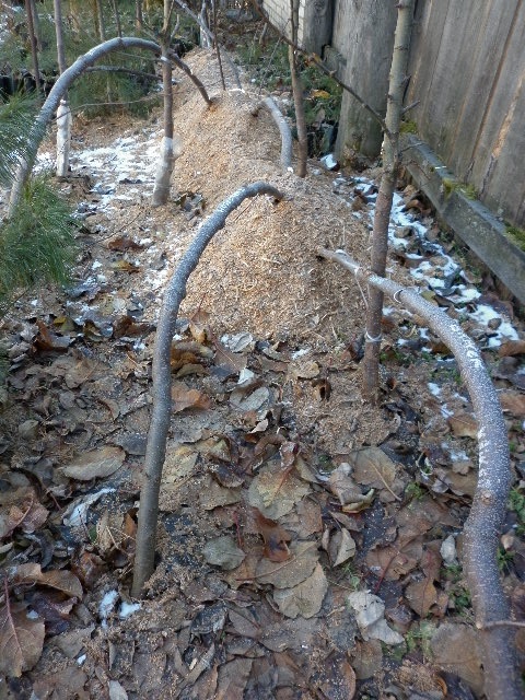 Ещё пример укрытия прививок не зимостойких сортов яблони , на зимостойких гибких подвоях..