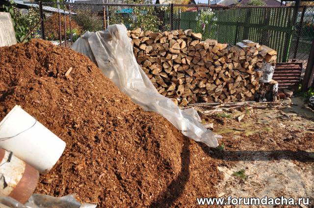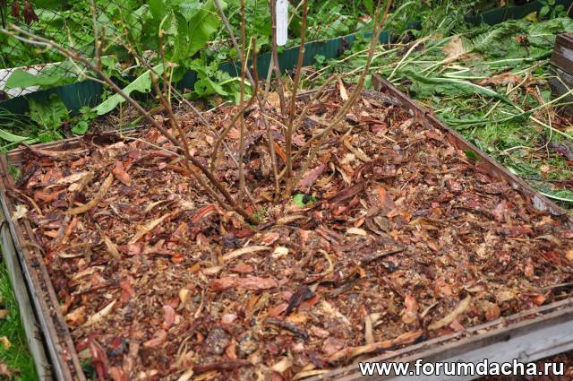 В приствольные круги кустарников и деревьев уложил срезанные цветы и замульчировал корой сосны.Нашел место ,где рубят дома под заказ .ощкуривают сосну.Набрать можно даром сколько угодно.С опилками сейчас проблема.Вот пришлось переключится на другой давальческий материал.