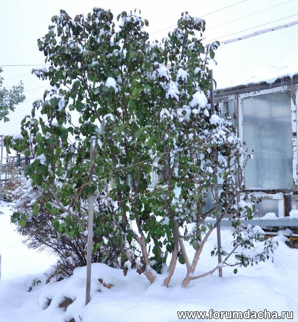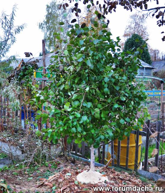 Покупал ее как ранетку полукультурку-оказалась груша.Дала плоды на 5 год,первый раз.Приствольный круг замульчирован травой и опилками.Посадил ее в качестве замещения под желтоплодной ранеткой.Ранетка старая,лет 40-45.По мере роста груши обрезаю ранетку,те ветки,которые дают тень.Сейчас убрал один из трех основных стволов,осталось два.На зиму вбиваю 2-3 кола и стягиваю вокруг них ветки груши,чтобы не сломало оседающим весенним снегом.