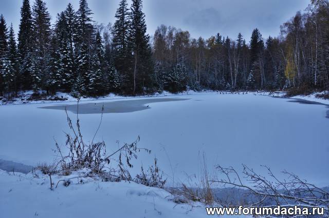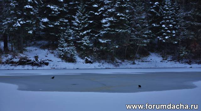 Нижнее озеро,видно как люди бросают камни проверяя лед .Лед уже крепкий.