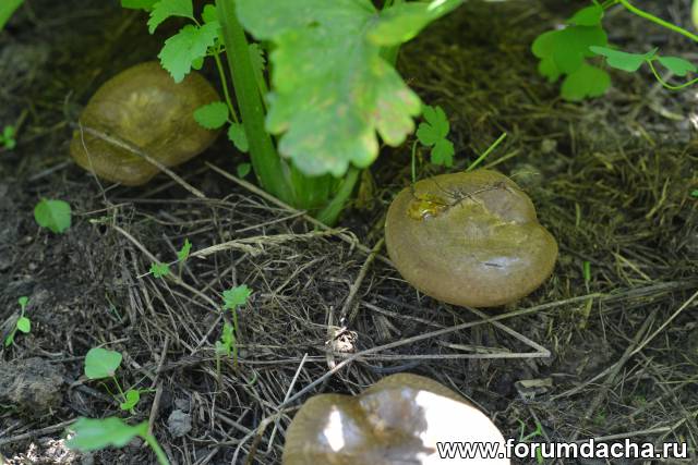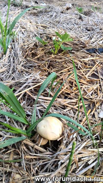 Пецица вновь проросла, уже в другом месте участка на соломе и рядом с ней.