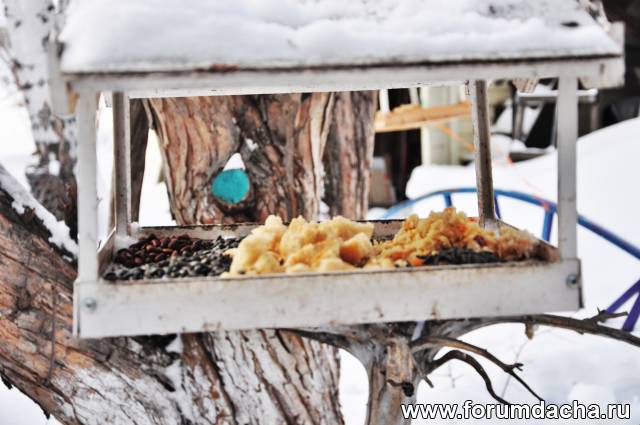 Плов,семечки,белый хлеб,орехи,сухари,Через час появились снегири и синицы.