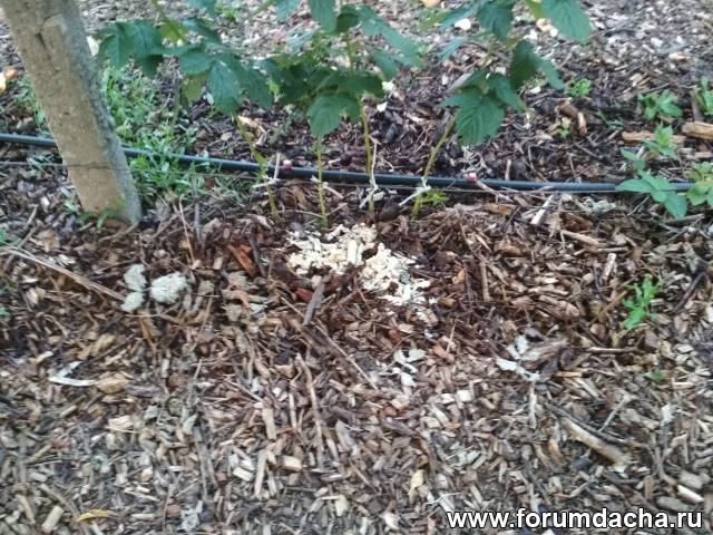 С месяц назад замульчировал ею 15-ти см. слоем без навозной прослойки посаженный в прошлом году малинник (около 35 кв.м), обильно пролил водой и поверху сдобрил аэрированным настоем из 1 ведра свежего козьего навоза и 2-х ведер этой же щепы на 200л. воды.
