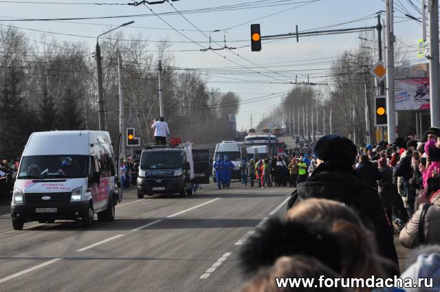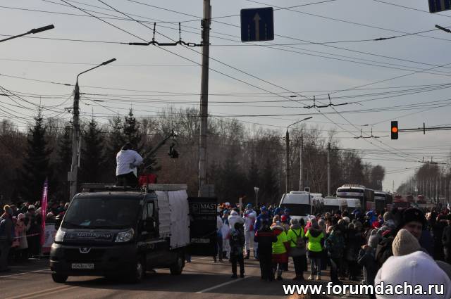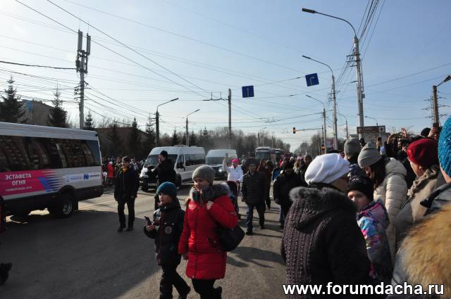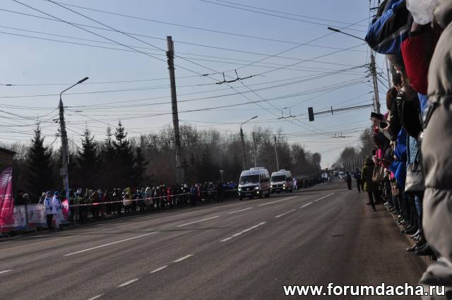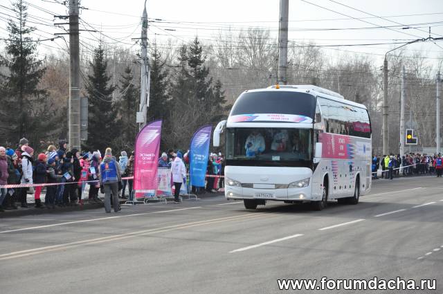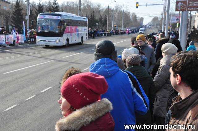 Автобус высаживает очередного участника эстафеты,участников около 70 человек.