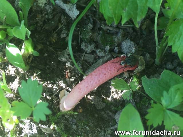 Месяц назад нашла мутинус, который "ел" ограждение грядки, пересадила его под мульчу малины, сегодня придя в малинник уловила характерный запах и начала искать сам гриб.